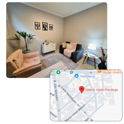 Sessões realizadas em consultório, num ambiente acolhedor e seguro. Um espaço só seu, sem pressa, onde você pode falar tudo que precisa, com privacidade e empatia.